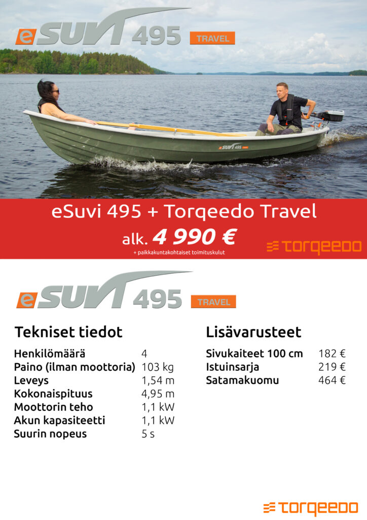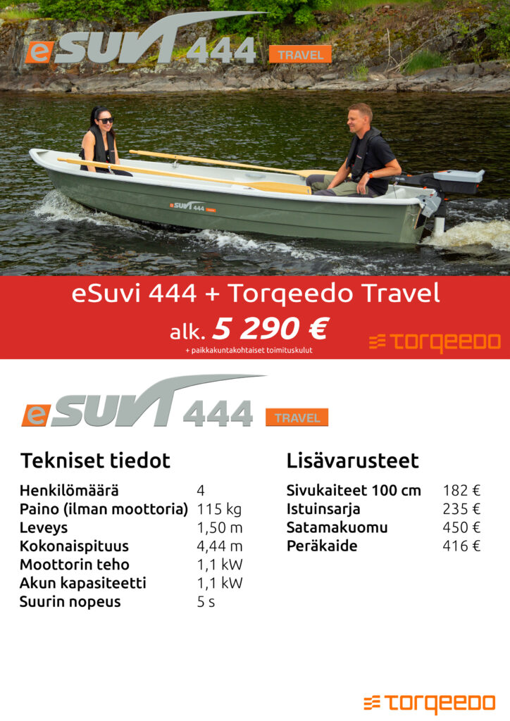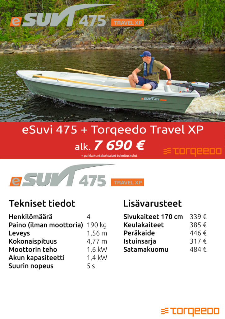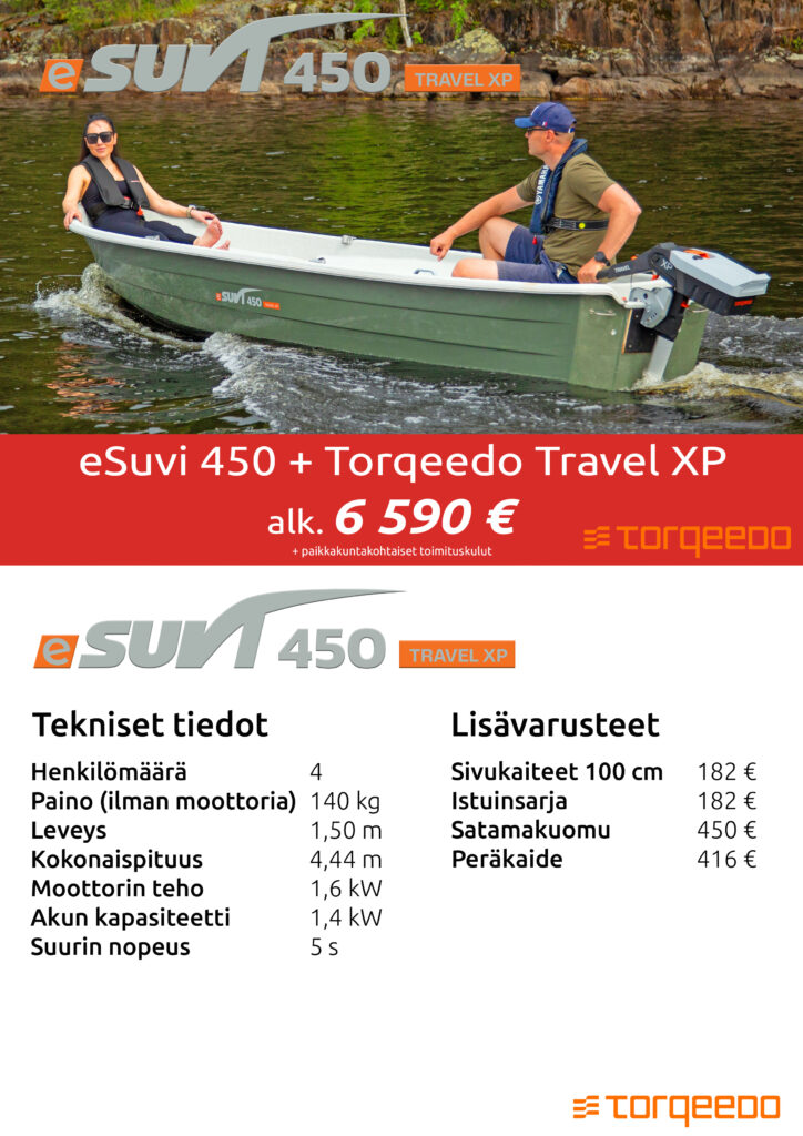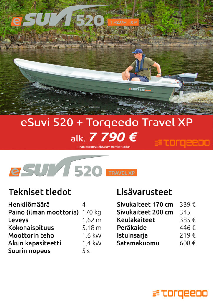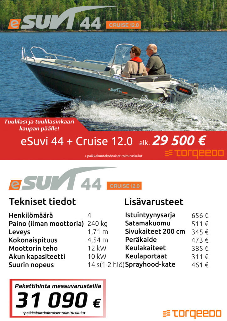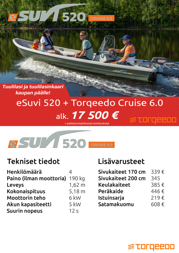 Suvi-veneet tuovat markkinoille sähköperämoottoreilla varustetun mallinsarjan. eSuvi-mallisto sisältää 7 venemallia. Veneet myydään Torqeedon sähköperämoottoreiden kanssa pakettina. Uusi mallisto tarjoaa päästöttömän, hiljaisen ja helppokäyttöisen vaihtoehdon mökkikäyttöön, kalastukseen ja retkeilyyn.